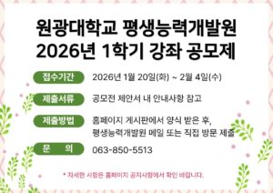 공지사항 2026학년도 1학기 평생능력개발원 강좌 공모제 시행 안내2026/01/19 원광대학교 평생능력개발원 2026년 겨울학기 미운영 안내2025/11/25 2025학년도 2학기 카카오와 함께하는 AI인생학교 글로컬 과정 수강생 모집2025/11/12 2025년 2학기 2차 글로컬 직업능력향상 교육 프로그램 학습자 모집 안내2025/10/14 자료실 2026학년도 강의 공모제 제안서 양식2026/01/19 특화 프로그램 공모제 시행 안내2025/07/31 수강신청서 양식2018/08/20 강좌개설 신청서 양식2017/11/24 연락처(063) TEL 063-850-5513 FAX 063-850-5517 위치 60주년기념관 3층