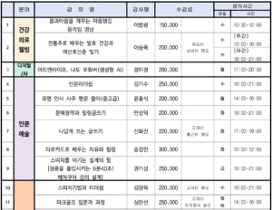 필독!! 1) 강의 신청 수강생이 기준(10명 이상) 미달 시 폐강 됩니다. 2) 강의실은 특정 강좌나 개인이 점유하여 사용하실 수 없습니다. 3) 수강 신청 접수 후 일주일 이내, 수강료 입금 안내 문자 발송해 드립니다.
