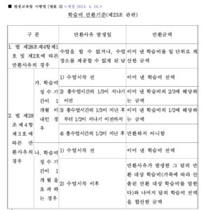 수강료 환불 홈평생교육과정수강료 환불 환불규정안내 – 과 오납 및 폐강된 경우 개인 계좌로 전액 환불 함. – 개인 사유로 반환 신청 시 증빙 서류를 첨부하고 원장이 인정하는 경우 “평생교육법 시행령 제23조”를 준용하여 반환 함. [별표 3] 학습비 반환기준(제23조 관련)(평생교육법 시행령)